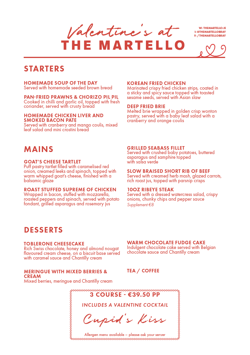Enjoy our three course set menu menu, paired with our Valentine's cocktail special, Cupid's Kiss for €39.50.